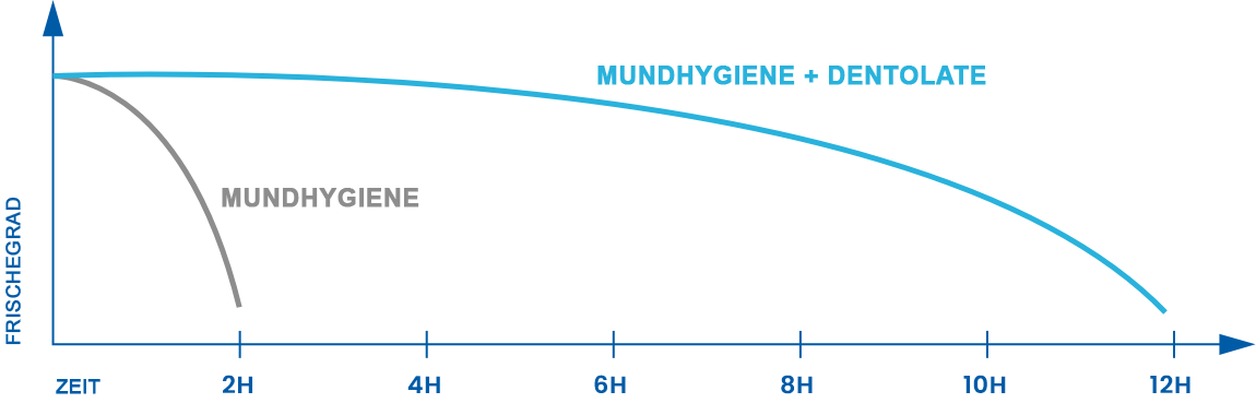 Wie die Grafik zeigt, erzielt Dentolan in Kombination mit der Mundhygiene einen wesentlich längeren Frischeeffekt als die Mundhygiene allein.